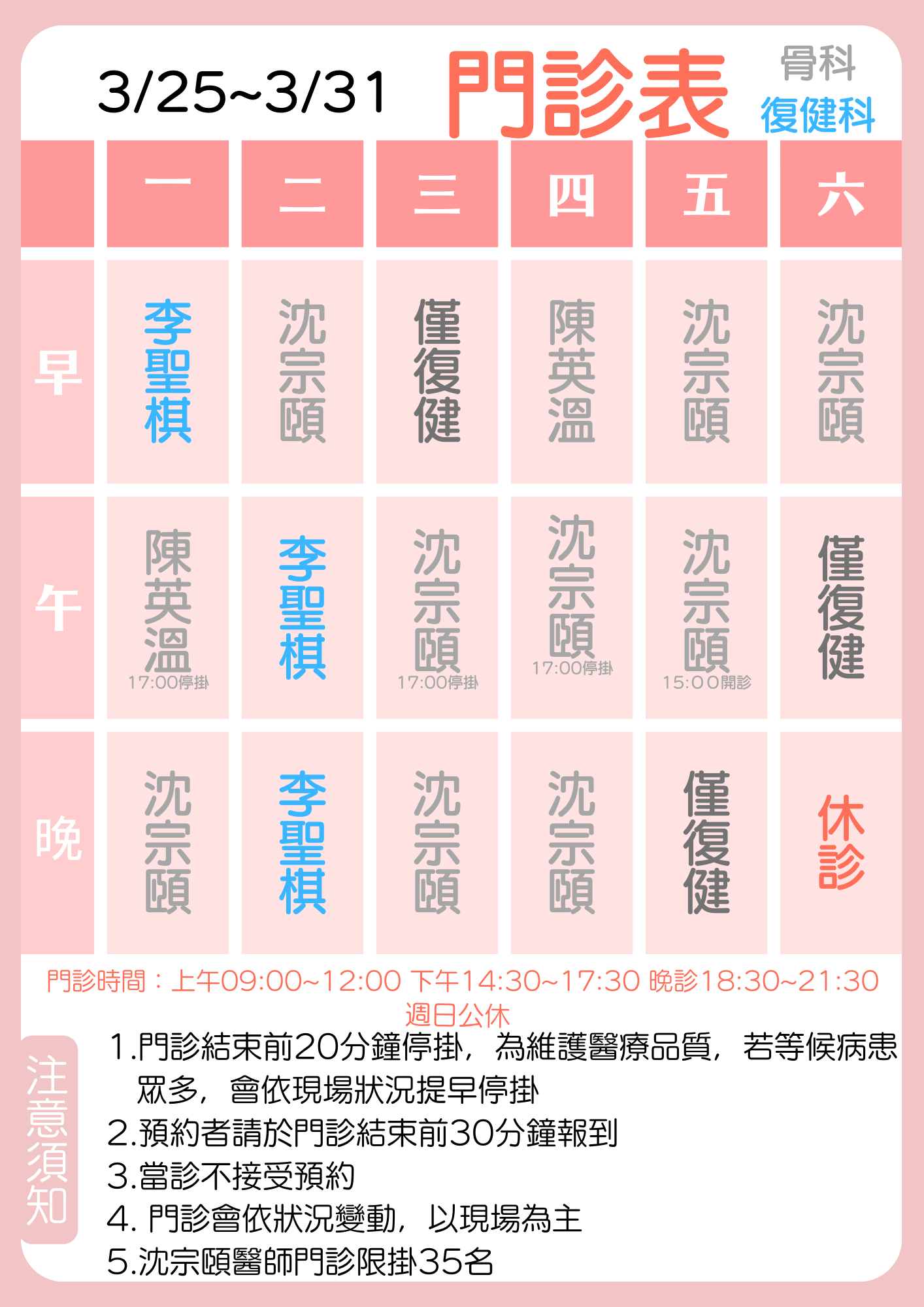| 3/25~3/31門診表